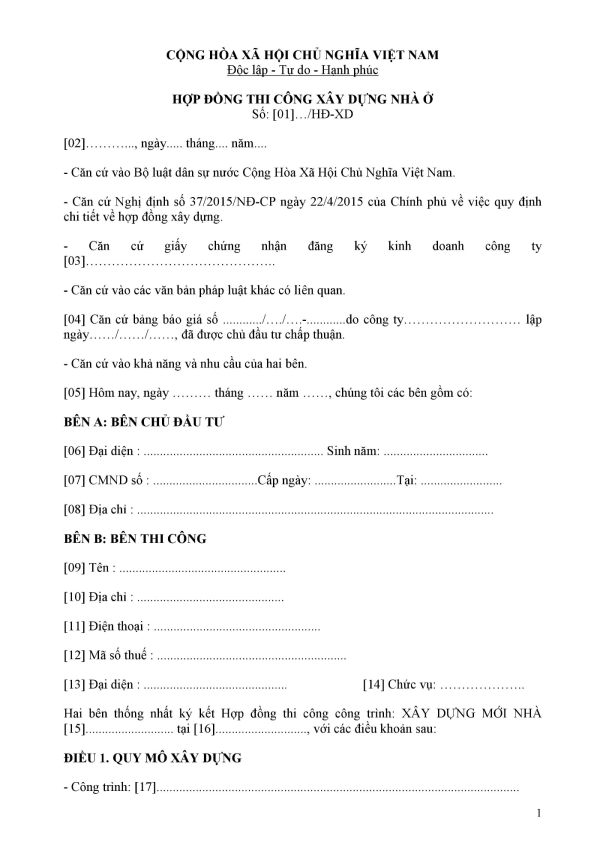 - [01] Hợp đồng xây dựng nhà ở số….: Kê khai theo số hiệu hợp đồng được kí kết giữa bên chủ đầu tư và bên thi công.